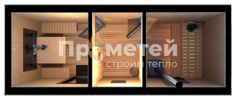 Каркасная баня Сканди 6 метров с тремя отделениями (комфортная комната отдыха, функциональная помывочная и большая парная) выполнена из высококачественных и благородных пород древесины: ХВОЯ, ОСИНА
