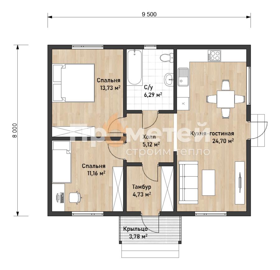 Каркасный дом 8x9.5 | 79м², 1 этажный под ключ