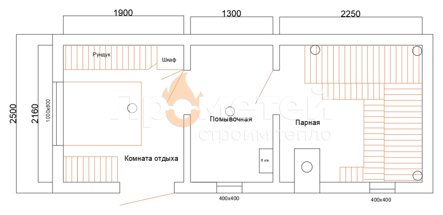 Чистовые полы в комнате отдыха - Шпунтованная доска 28 мм толщиной (хвоя), Проливные трапики из лиственницы 27 мм толщиной, Оцинкованный жёлоб в помывочном и парном отделении, черновые полы - доска сухая антисептированная 25х100 мм