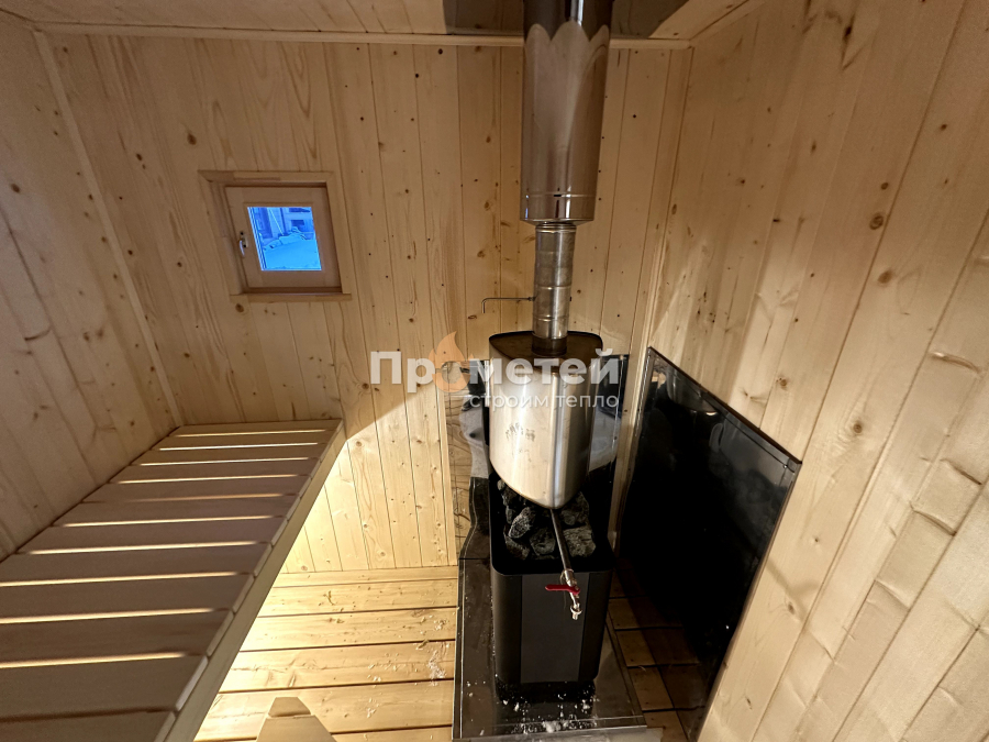 Печь УЗПО Анютка 10 м3 объемом помещения и закладкой камней 120 кг. Печное оборудование: Сэндвич труба, дефлектор конуса, опорная заглушка, поворотный шибер, притопочные листы из нержавеющей стали 304 марки, Защитные листы минерита.